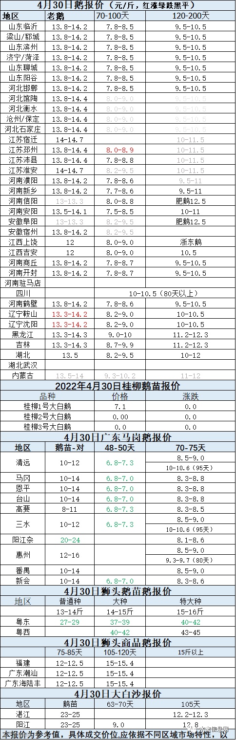 2022年4月30日各品种鹅苗价格