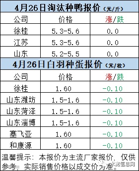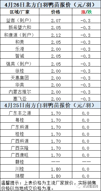 一、4月25日晚至4月26日 白羽肉鸭报价