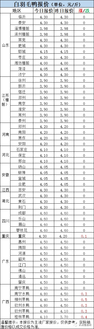 明日鸭苗报价北方下滑0.3元/羽,南方报价持稳。连续上涨后,市场接受度下降;饲料成本、养殖风险、产品涨势放缓及苗量持续攀升,对苗价均带来抑制。