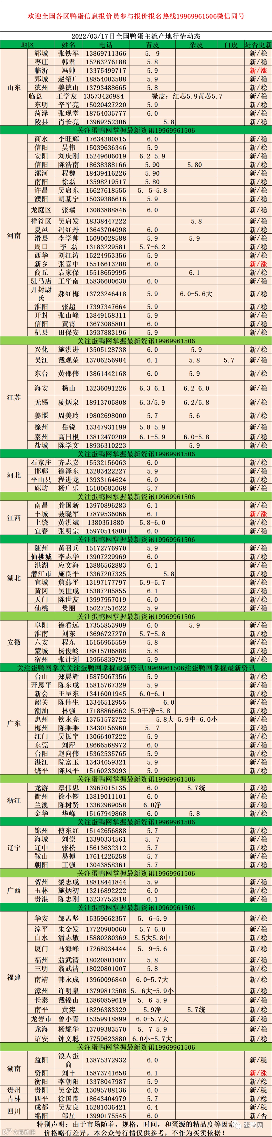 2022年03月17日鲜鸭蛋价格:初产至10个头5.3元 。 10个头至9个5.5元。9个头至大蛋5.7元(鸭蛋价格仅供参考)。