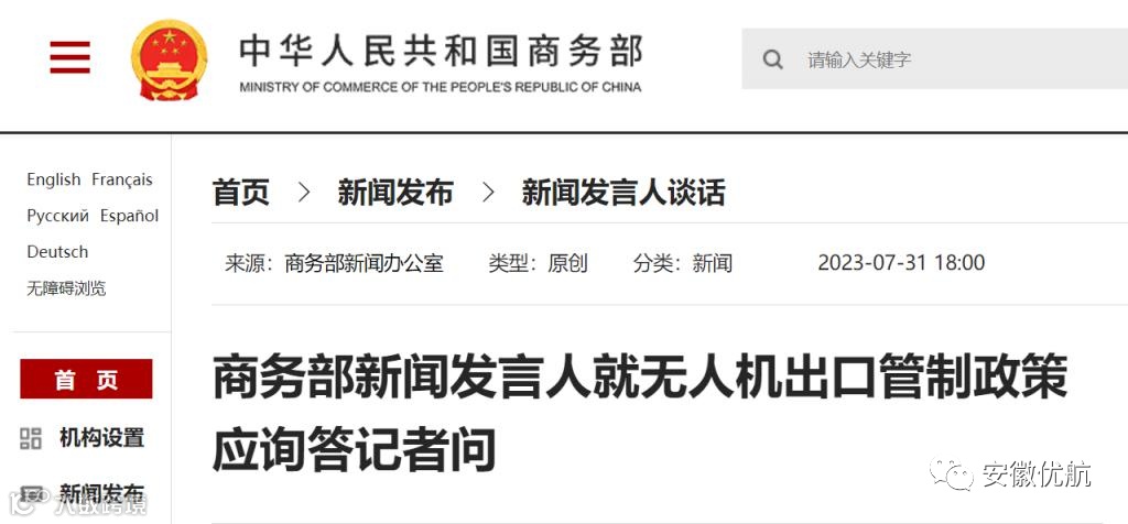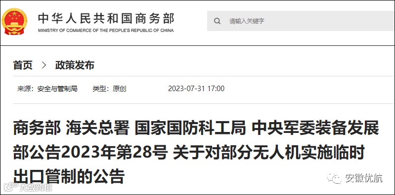 7月31日,商务部、海关总署、国家国防科工局、中央军委装备发展部发布关于对部分无人机实施出口管制的公告。