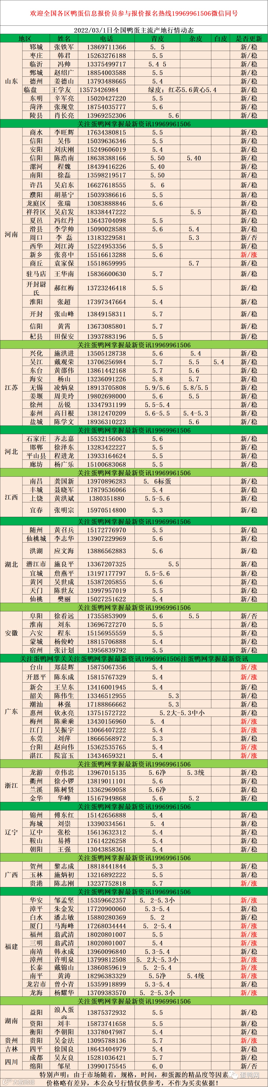 2022年03月1日鲜鸭蛋价格:初产至10个头5.0元 。 10个头至9个5.2元。9个头至大蛋5.4元(鸭蛋价格仅供参考)。