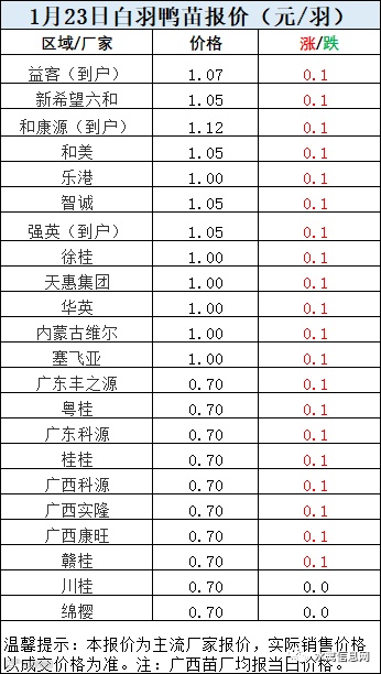 一、2022年1月23日白羽鸭苗报价