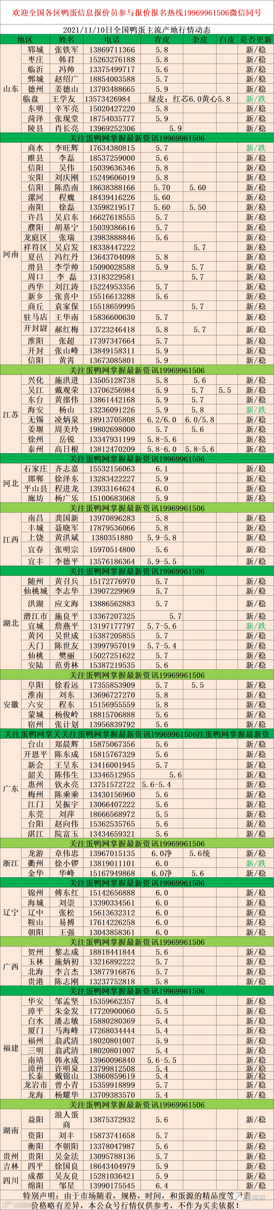 2021年11月10日鲜鸭蛋价格:初产至10个头5.6元 。 10个头至大蛋6.0(鸭蛋价格仅供参考)。