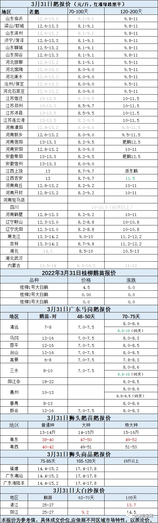 2022年3月31日各品种鹅苗价格