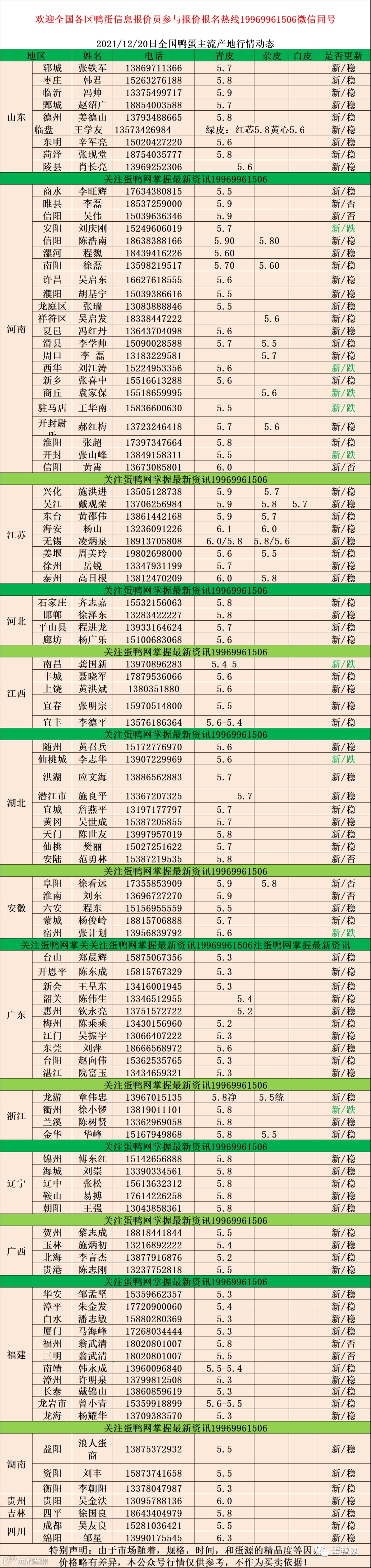 2021年12月20日鲜鸭蛋价格:初产至10个头5.0元 。 10个头至9个5.2元。9个至8个5.4元。8个至7个半5.6元,7个半至7个头5.7.元足7个头5.8元(鸭蛋价格仅供参考)。