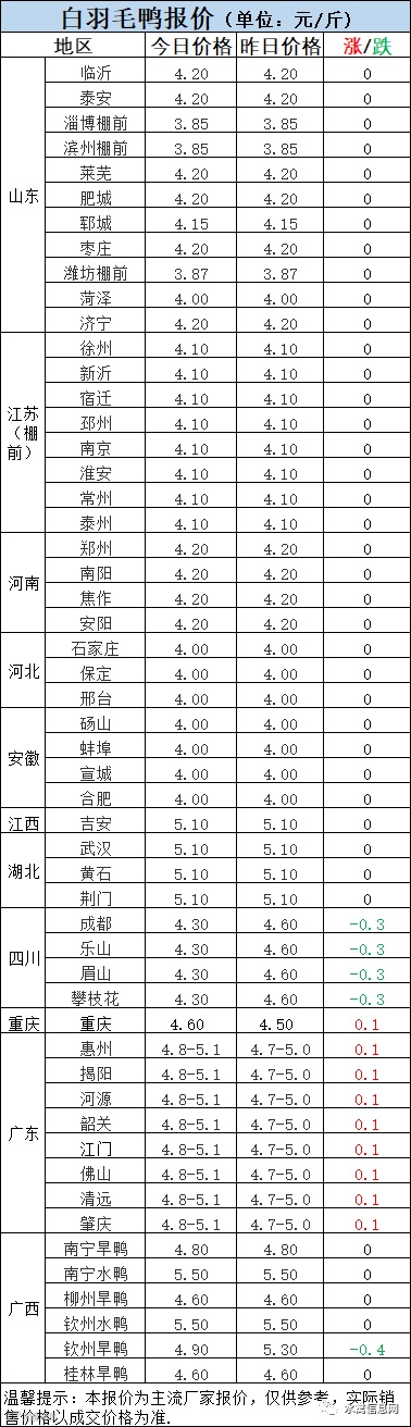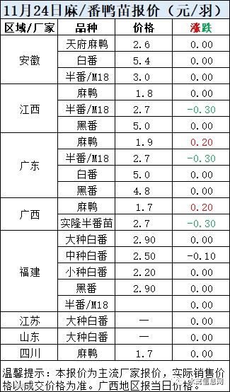 明日麻鸭苗报价局部上涨0.2元/羽。半番鸭苗报价下滑0.3元/羽。