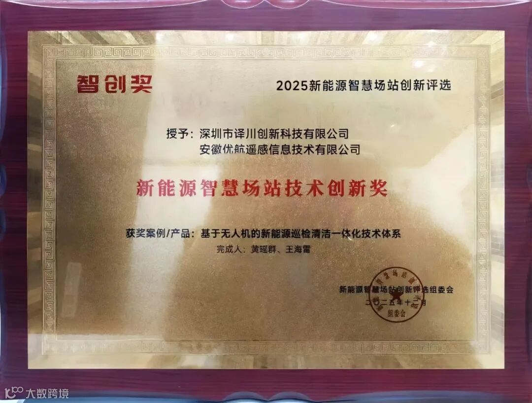 优航遥感与译川创新受邀参展,凭借在新能源无人化运维领域的深厚技术积累与丰富实践成果,以“基于无人机的新能源巡检清洁一体化技术体系”,成功获评 2025 新能源智慧场站创新评选“新能源智慧场站技术创新奖”,得到行业认可。