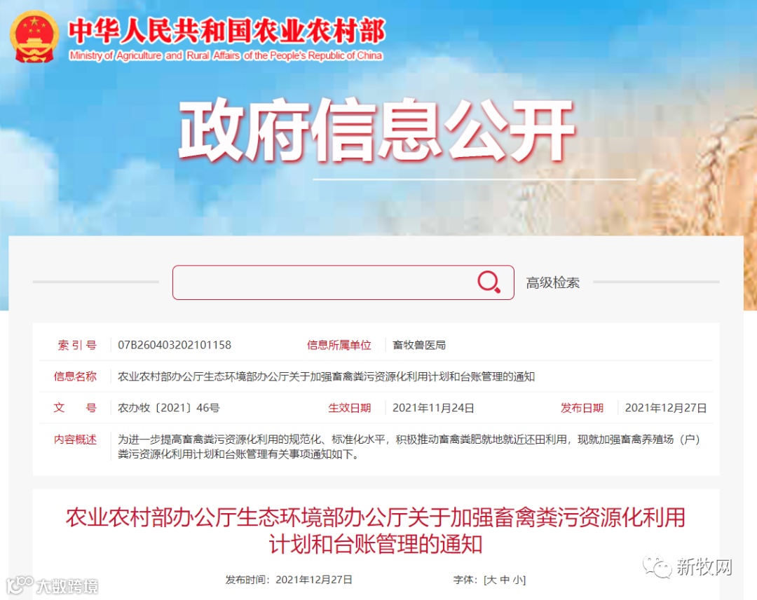 新牧网讯 12月27日,农业农村部、生态环境部联合印发《关于加强畜禽粪污资源化利用计划和台账管理的通知》(以下简称通知)。