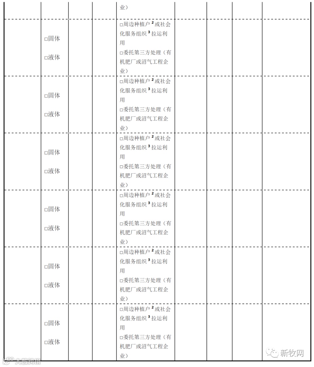 备注:1.运出量的固体部分单位为吨,液体部分(含固液混合)单位为立方米;2.种植户是指与养殖场(户)签订粪污消纳协议的或临时施用粪肥的种植户,含流转土地和自有土地从事种植的养殖场(户);3.社会化服务组织是指专业从事粪污堆沤腐熟、贮存发酵、粪肥运输和施用等服务的组织机构;4.身份证号码仅在粪肥提供给种植户时填写,填写利用粪肥的种植户身份证号码,由社会化服务组织利用或委托第三方处理可不填写。5.畜禽粪污(或粪肥)提供给不同的种植户、第三方服务组织的,应在表中按顺序逐一填写。6.规模养殖场和规模以下养殖场(户)日常填写,可自行增页。