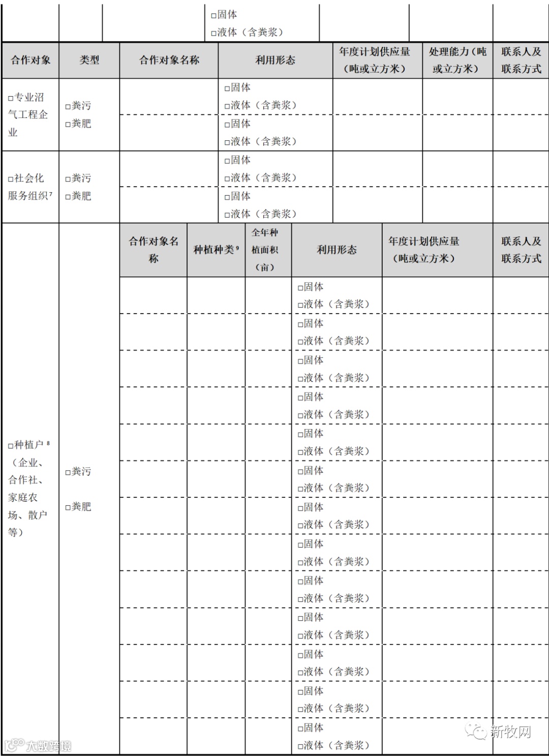 备注:1.粪污是指养殖场(户)全年产生的固体、液体粪污,包括粪便、污水、垫料等;2.粪肥是指粪污经发酵腐熟等方式处理后的产品;3.液体粪肥包括发酵腐熟后的粪水、粪浆、沼液等;4.深度处理是指养殖场(户)产生的污水经组合工艺深度处理后达到直接排放、农田灌溉或养殖回用的标准;5.该部分是指养殖场(户)利用土地流转的土地或自有土地从事种植业,不包括与种植户签订粪污消纳协议的内容;6.种植面积是指作物实际种植面积,不同地块种植不同作物的逐一填写,一年多季作物的按每茬作物逐一填写;7.社会化服务组织是指专业从事粪污堆沤腐熟、贮存发酵、粪肥运输和施用等服务的组织机构;8.种植户是指与养殖场(户)签订粪污消纳协议的或临时施用粪肥的种植户;9.种植种类按照表中的粪肥就地就近还田利用计划(自用/部分自用)中的种植种类填写,不同地块种植不同作物的逐一填写。10.规模养殖场或规模以下养殖场(户)每年填写,可自行增页。