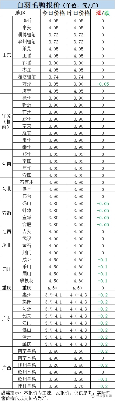 明日麻鸭苗报价整体稳定,广西下滑0.1元/羽。半番鸭苗报价上涨0.2元/羽。