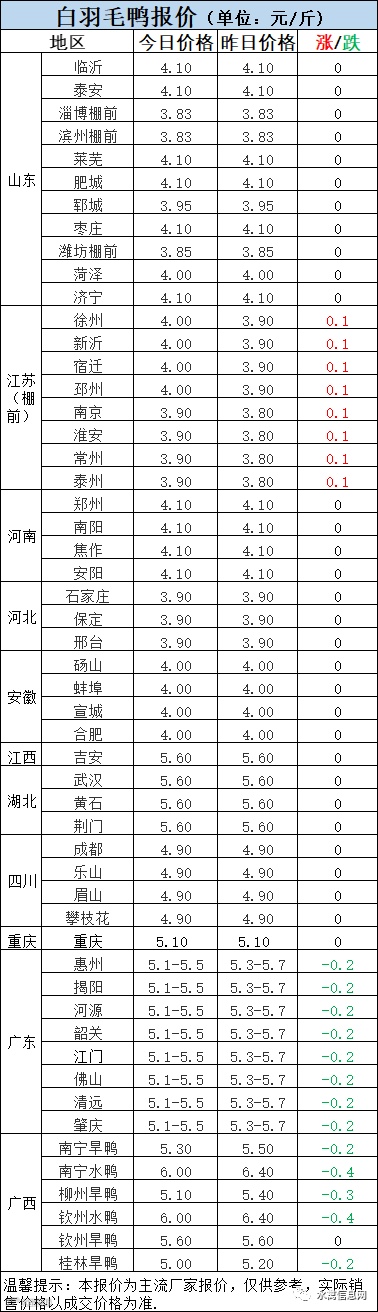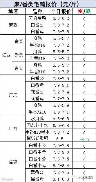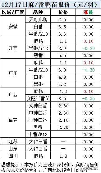明日麻鸭苗报价上调0.1元/羽。半番鸭苗报价下滑0.3元/羽。