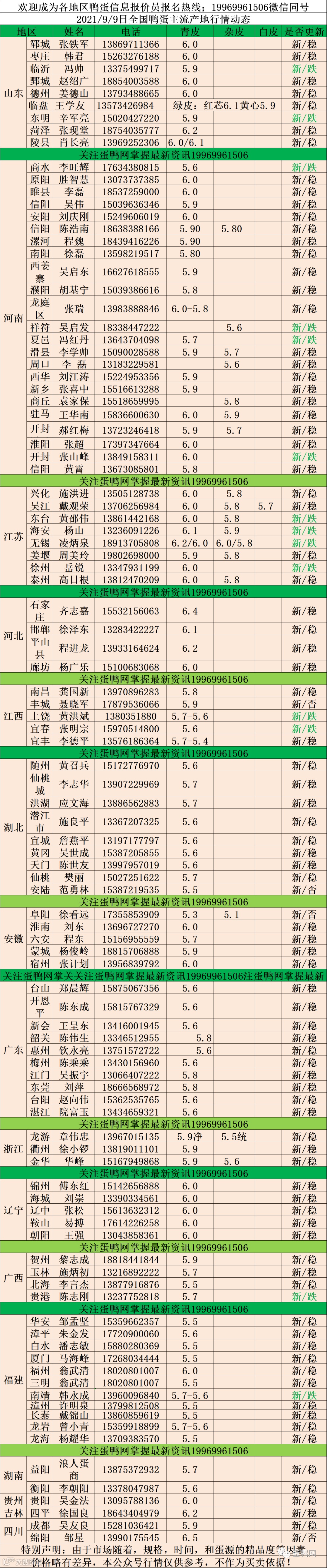 2021年9月9日鲜鸭蛋价格:初产至10个头5.2 元 10个至9个头5.6 元,9个至大蛋6.0元(鸭蛋价格仅供参考)。