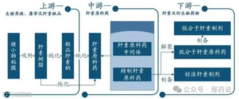 肝素(Heparin)发现于1916年,因从肝脏发现而得名,是动物结缔组织中肥大细胞产生的一种粘多糖,一种特殊的多糖,结构极其复杂,目前无法通过化学合成。由于肝素良好的抗凝血作用,是临床抗凝血不可或缺的药物。原料需要从猪小肠中提取,产业链很长,具有很强的资源属性。生猪屠宰后,约90%的猪小肠被用于肝素生产,10%用于食品加工。从产业链上来看,肝素行业包括生猪养殖、肝素粗品提取、肝素原料药及终端的普通肝素制剂和低分子量肝素制剂。