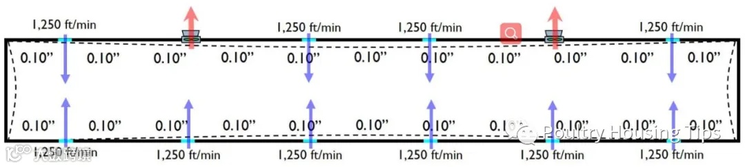 大鸡舍的最小通风系统使用小风机存在另一个潜在的问题新鲜空气的分布问题。在25Pa的负压下,一个1.07 m(42 inch)长的小窗开口5 cm每分钟的进风量约为12.75 m³。那么如果用一台18风机进行通风,7个小窗就能满足需求了。问题是这是假设鸡舍密闭非常好的情况下,而这种密闭情况根本不可能实现。即便是鸡舍的密封能够在开启一台18风机的情况下产生37.5Pa的负压,那也会有大量的空气从漏风点进入鸡舍。事实上,一台18风机排出的风量大约有一半是从漏风点进入鸡舍的。这就意味着3或者4个小窗就够了。一个152.4 m长的鸡舍若是只开启3或4个小窗会导致鸡舍内沿着鸡舍纵向的空气质量和空气温度的剧烈变化。