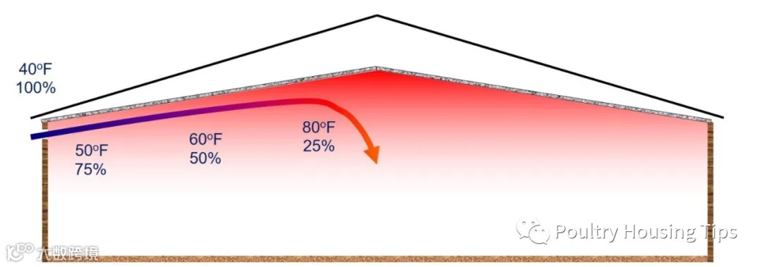 有两个原因可以解释为什么某个负压值是合适的。首先,当风机运行时产生的负压,不管是从鸡舍任何位置来看,负压值应该大体上是一致的(图2)。这就意味着不管小窗距离风机有多远,鸡舍内外的静压差值都是一样的。其次,通过控制负压的大小,饲养者可以控制小窗的进风风速(图3)。现在如果一个鸡舍的所有小窗开口一致,那么不管从哪个小窗进入鸡舍的空气的速度都是一样的,那么不论是从鸡舍哪个位置的小窗,进入鸡舍的风量与鸡舍其它小窗进入鸡舍的风量是一样的(图2)。这一点很重要,因为这就意味着一个正常运行的负压系统,鸡舍内的鸡只不管距离风机有多远,都能接收到同样多的新鲜空气。同样重要的是控制进入鸡舍的风速,因为风速控制着气流进入鸡舍后的运动路径。如果外界空气慢慢的(低负压)进入鸡舍,又冷又重又潮湿的空气将会迅速的落到地面上。但是如果外界空气快速(高负压)进入鸡舍,那么气流会沿着天花板的方向移动,天花板附近不仅远离鸡群,还聚集着热空气。冷空气沿着天花板运行的路径越长,在落到地面附近时,会被预热的更好(图4)。重要的是:温度每升高11℃(20 ℉),空气的含水能力提高一倍。所以说气流在天花板附近待的时间越长,空气含水能力越高,能够从鸡舍内带走的水分也就越多。