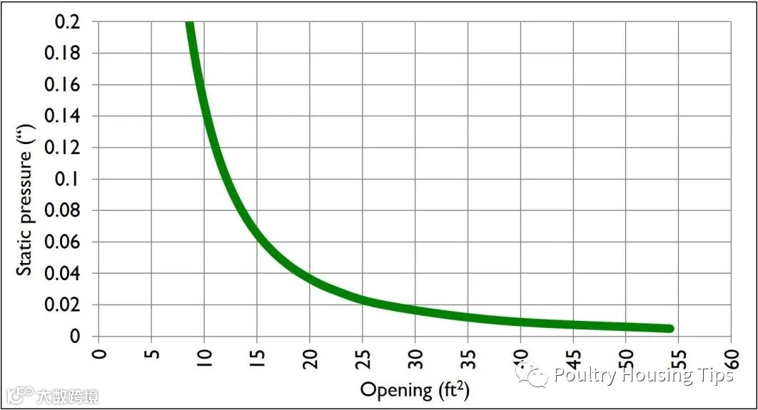 在25Pa的负压下,风机每排出21.24m³(750cu ft)空气需要大约0.093㎡(1sq.ft)的进风面积,因此一台18风机只需要0.37㎡(4sq.ft)的进风面积。如果进风面积过大,负压就会降低,进入鸡舍的新鲜空气在落到地面附近之前可能就没有足够的速度沿着天花板移动,也就不能充分预热。更糟糕的是,如果进风面积足够大到风机运行时不产生负压,那么当风机运行时,只有风机附近区域的鸡只会接受到新鲜空气。