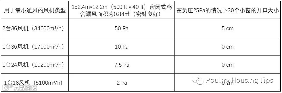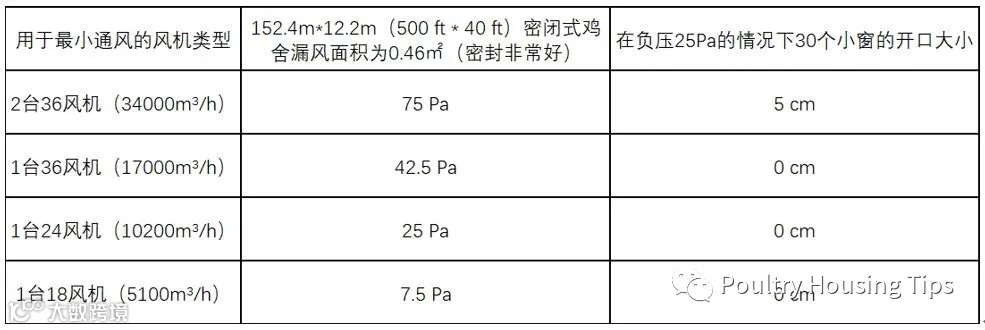 表2.在一个开启30个小窗的152.4m*12.2m(500 ft * 40 ft)密闭式鸡舍运行不同尺寸的最小通风风机