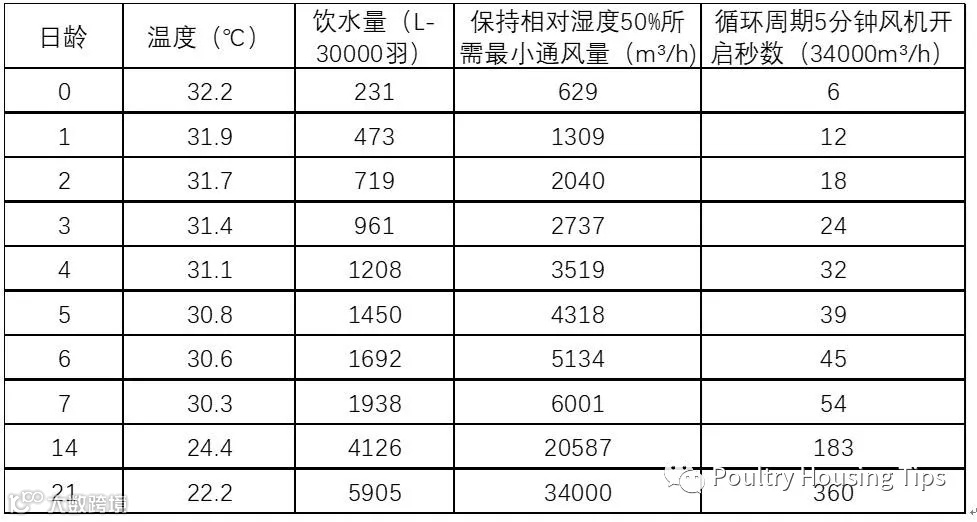 (根据手机应用 Poultry 411确定了最小通风量,外界环境=4.4℃/50%Rh)