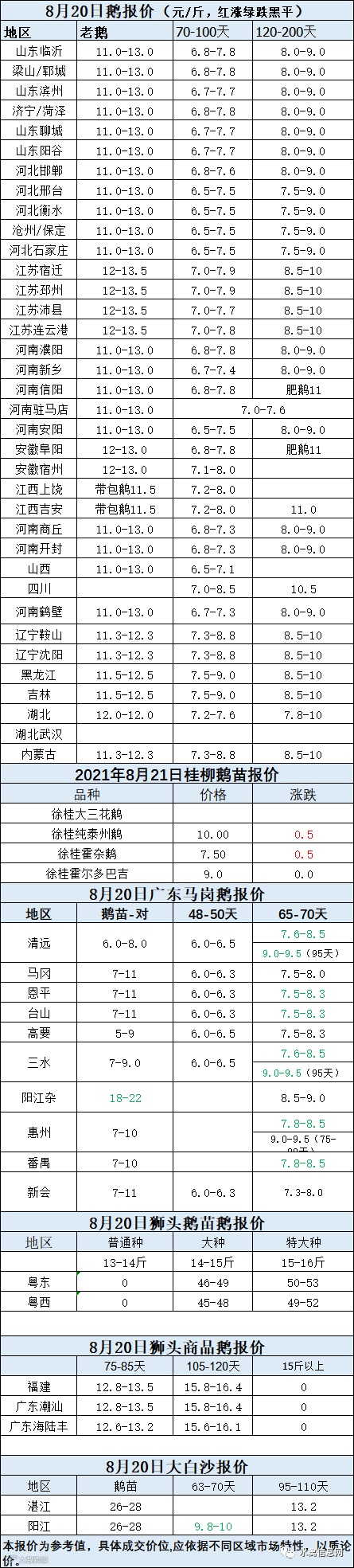 2021年8月20日鹅种蛋价格(元/枚)停报