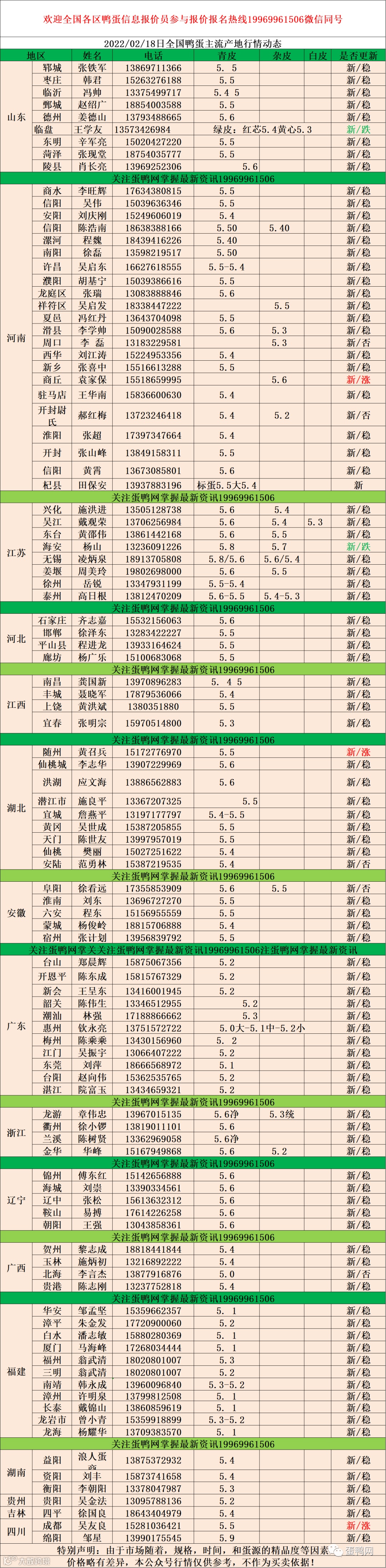 2022年02月18日鲜鸭蛋价格:初产至10个头5.0元。10个头至9个5.2元。9个至7个半5.4元。7个半至7个头5.5元,足7个头5.6元(鸭蛋价格仅供参考)。