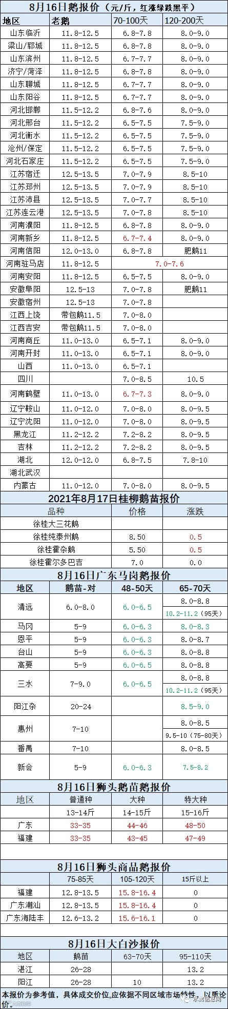 2021年8月16日鹅种蛋价格(元/枚)停报