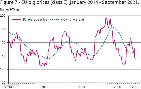 我在7月份的专栏文章中指出,欧盟养猪户无意扩张——非洲猪瘟、价格波动和低利润率都没有乐观的前景。如图7所示的欧盟生猪价格图表显示出波动性,但也显示出平稳的迹象。价格疲软,在这种水平上,大多数欧盟农民都在赔钱。