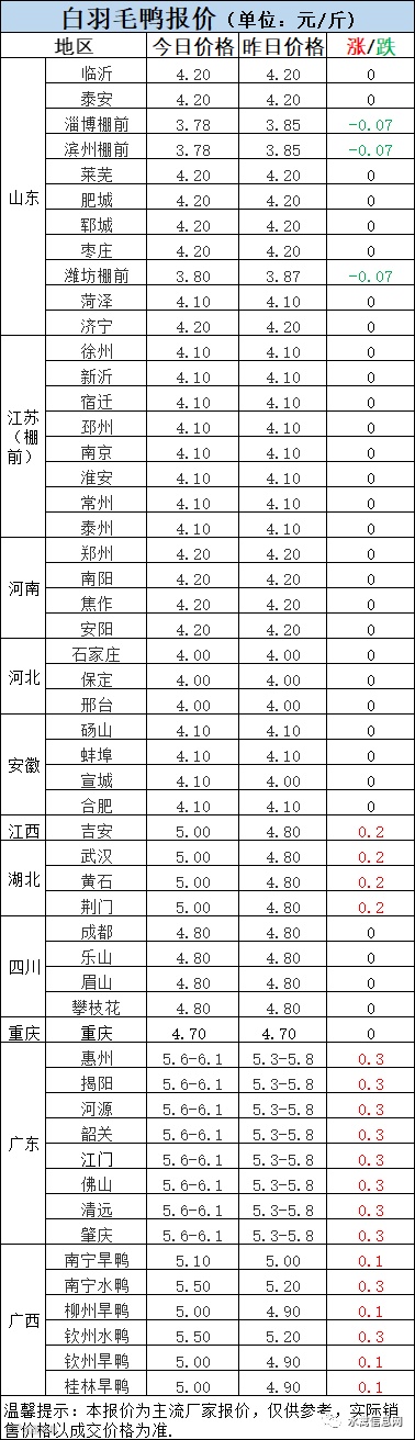 1:今晚北方毛鸭报价涨跌不一,近日温度再次上升,山东棚前略有下滑,周边区域进场价稳中走强。天热放养量下降,回收率降低,冻品渐次走强,拉动毛鸭价格上涨。疾病严重,饲料高位,导致合同鸭回收成本持续高位,产品低位运行,冷藏日子依然艰难。