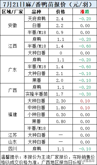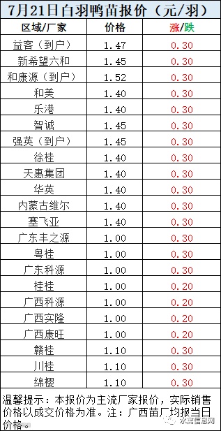 一、7月21日白羽鸭苗报价