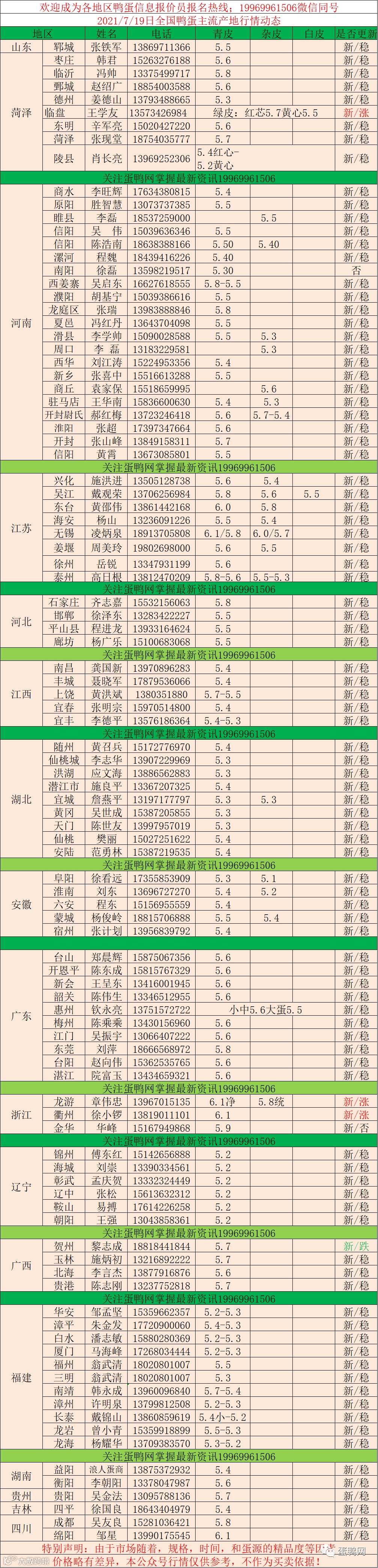 2021年7月19日鲜鸭蛋价格:初产至大蛋5.2(鸭蛋价格仅供参考)。