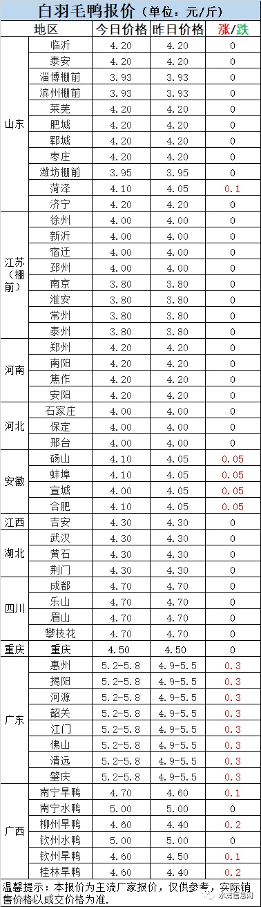 1:今晚北方毛鸭报价整体稳定,局部小幅上调。天热放养量下降,回收率降低,冻品渐次走强,拉动毛鸭价格上涨。疾病严重,饲料高位,导致合同鸭回收成本持续高位,产品低位运行,冷藏日子依然艰难。