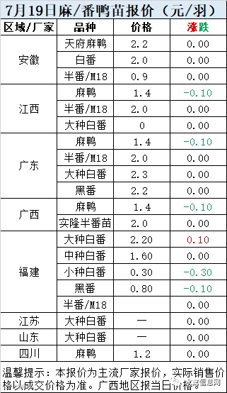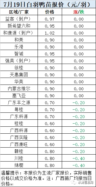 一、7月19日白羽鸭苗报价