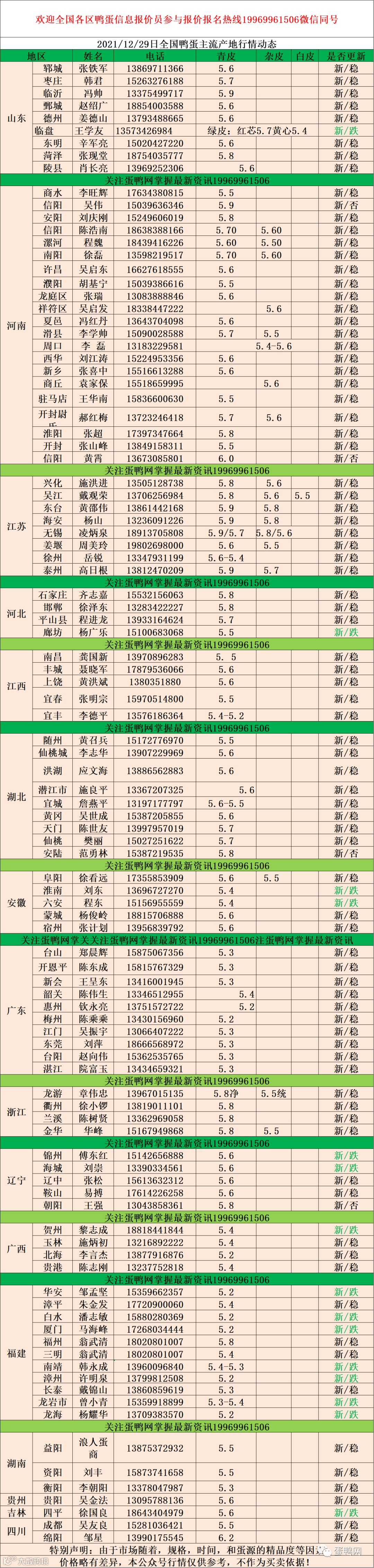 2021年12月29日鲜鸭蛋价格:初产至10个头5.0元 。 10个头至9个5.2元。9个至7个半5.4元。7个半至7个头5.5元,足7个头5.6元(鸭蛋价格仅供参考)。