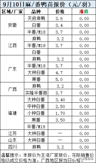 一、9月9日晚至9月10日 白羽肉鸭报价