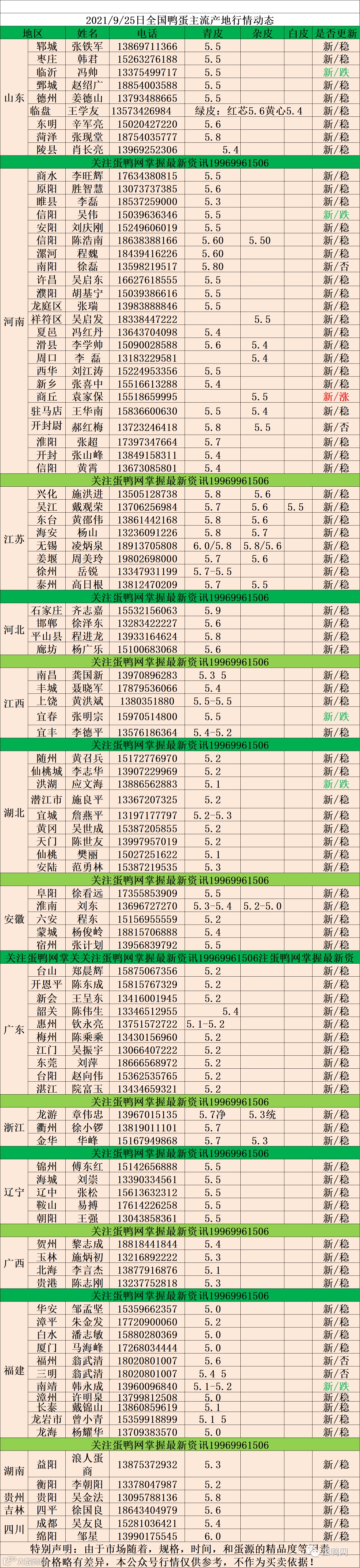 2021年9月25日鲜鸭蛋价格:初产至10个头5.0元 。 10个至9个头5.3 元, 9至8个头5.4 。8个头至大蛋5.5元(鸭蛋价格仅供参考)。