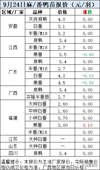 一、9月24日白羽鸭苗报价