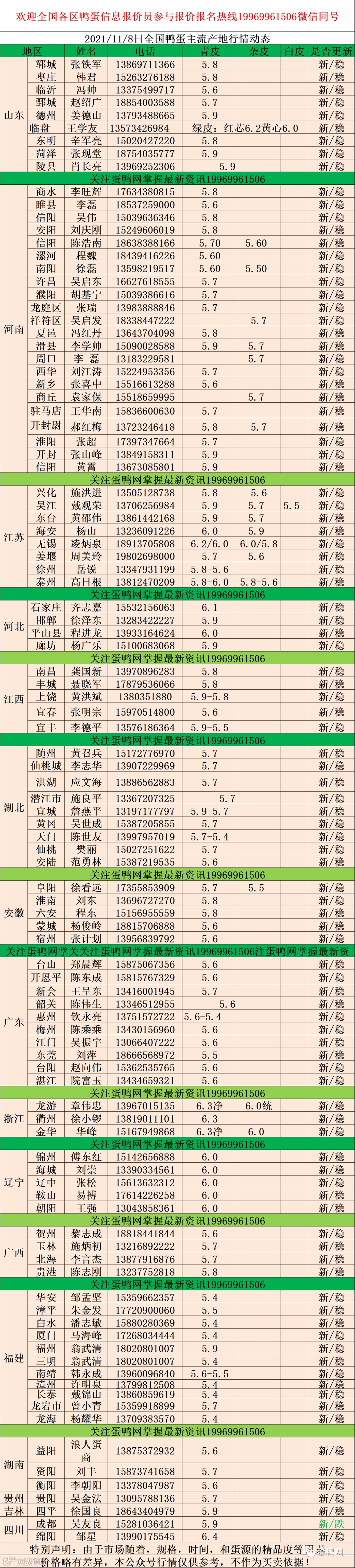 2021年11月8日鲜鸭蛋价格:初产至10个头5.6元 。 10个头至大蛋6.0(鸭蛋价格仅供参考)。