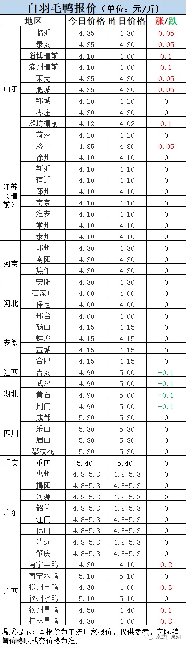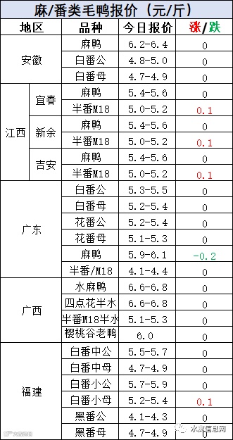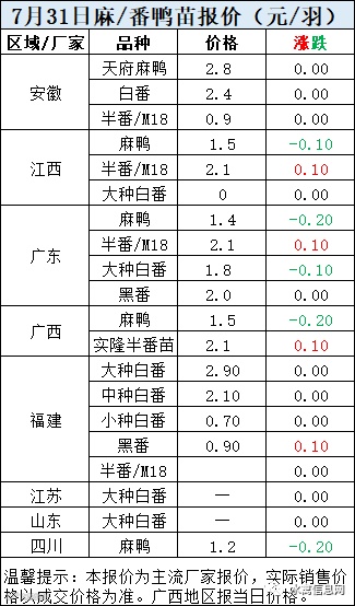明日麻鸭苗报价下滑0.1元/羽。半番鸭苗报价上涨0.1元/羽。