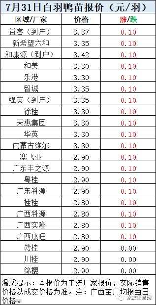 一、7月30日晚至7月31日 白羽肉鸭报价