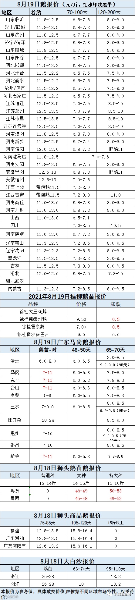 2021年8月19日鹅种蛋价格(元/枚)停报