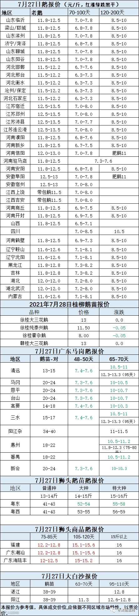 2021年7月27日鹅种蛋价格(元/枚)停报