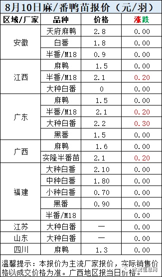 一、8月10日白羽鸭苗报价