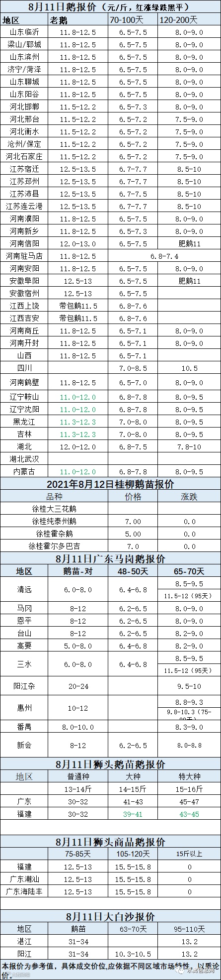 2021年8月11日鹅种蛋价格(元/枚)停报