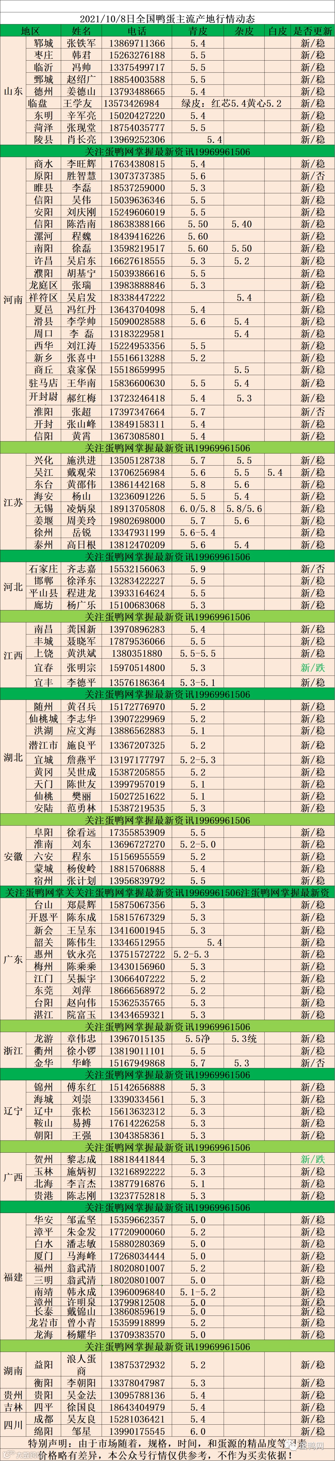 2021年10月8日鲜鸭蛋价格:初产至10个头5.0元 。 10个头至大蛋5.3(鸭蛋价格仅供参考)。
