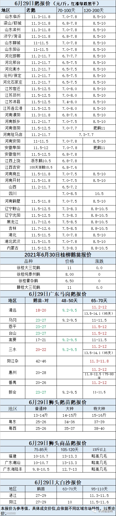 2021年6月29日鹅种蛋价格(元/枚)停报