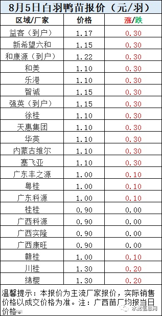 一、8月5日白羽鸭苗报价