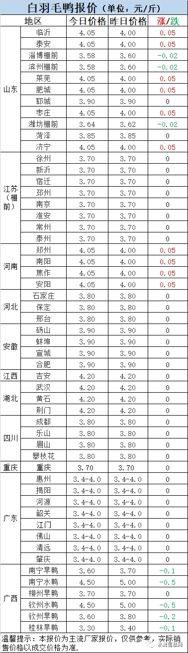 1:今晚北方毛鸭报价小幅上涨。高温逐渐适应,出栏情况趋于平稳。市场鸭不多,但冻品走跌,收购积极性亦有限。棚前损耗大,价格略弱。疾病严重,饲料高位,导致合同鸭回收成本持续高位,冷藏日子依然艰难。