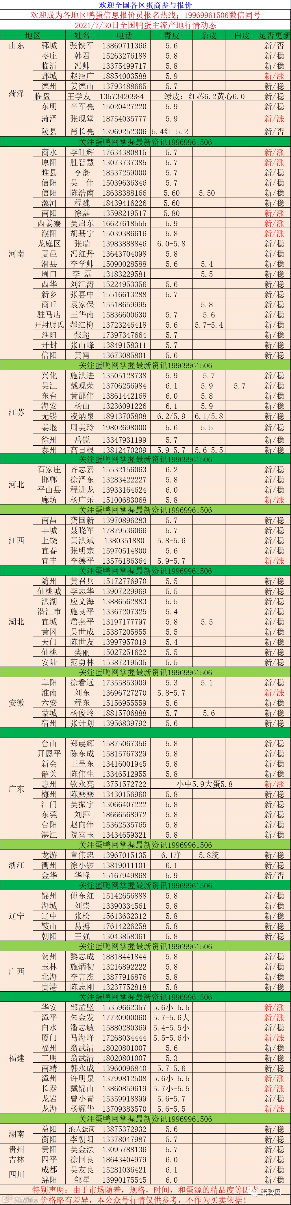 2021年7月30日鲜鸭蛋价格:初产至大蛋5.8(鸭蛋价格仅供参考)