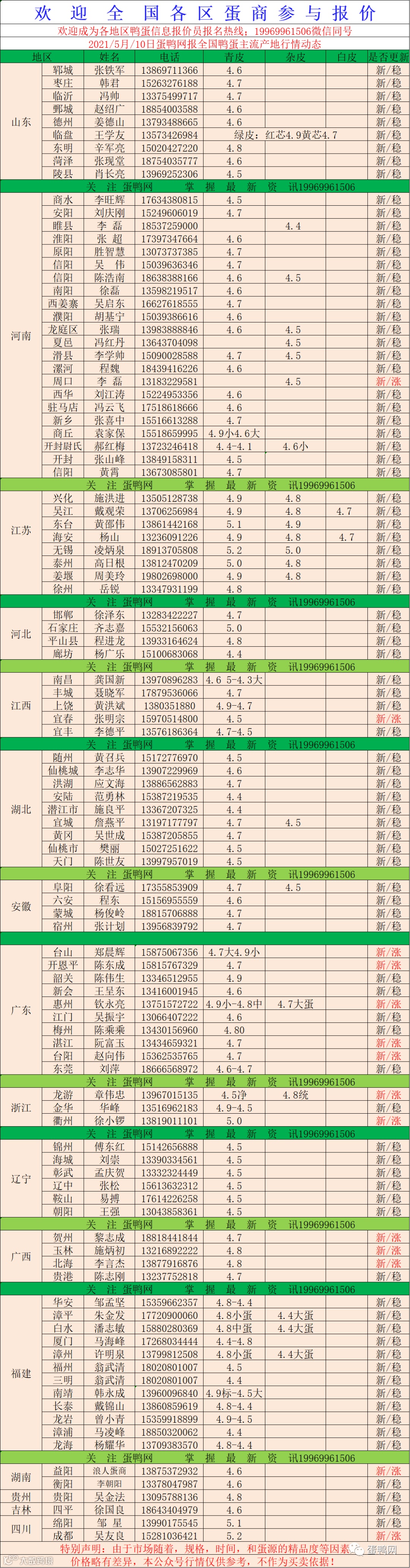 2021年5月10日鲜鸭蛋价格:初产5.0至大蛋4.5(鸭蛋价格仅供参考)。